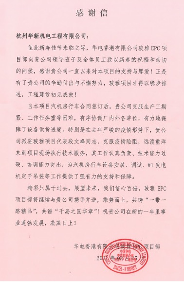 客戶(hù)的感謝信、表?yè)P(yáng)信既是認(rèn)可亦是鞭策,榮譽(yù)屬于過(guò)去,能不能保留住這份榮譽(yù)關(guān)鍵在于現(xiàn)在的努力和未來(lái)的成果。初心如磐,使命在肩,在“為用戶(hù)創(chuàng)造價(jià)值”的這條路上,華新機(jī)電一直秉持著信念前行。